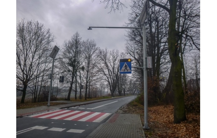 wykonanie oznakowania poziomego i pionowego oraz urządzeń BRD, w tym: wykonanie oznakowania aktywnego przejścia dla pieszych (znaki aktywne D-6 z światłami pulsacyjnymi koloru żółtego zasilanymi poprzez instalację solarną, detektory ruchu oraz zabudowano w ciągu jezdni aktywne punktowe elementy odblaskowe);